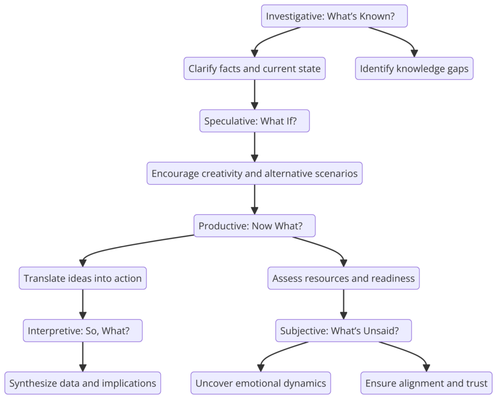 In today’s fast-paced, complex business landscape, mastering Strategic Inquiry for Leadership Success has become an essential skill. The shift from seeking answers to crafting intelligent questions is now more critical than ever, as leaders navigate uncertainties and unlock their teams’ potential. Inspired by The Art of Asking Smarter Questions, this article explores five key categories of strategic inquiry—Investigative, Speculative, Productive, Interpretive, and Subjective. Each category offers a unique perspective to enhance decision-making. By mastering and balancing these question types, executives can cultivate curiosity, drive innovation, and ensure thoughtful, comprehensive leadership.